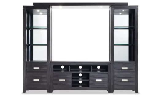 My Elevations Entertainment Complete Wall System has high-end style without the crazy price tag! This entertainment center set is equipped with ample storage space and features mirrored shelves and recessed lighting. The simplistic design adds a rustic feel and is the perfect piece to add a contemporary feel to your living space.