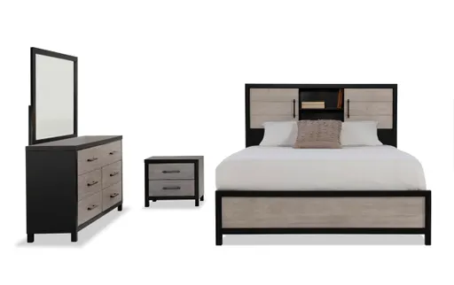 Get a good night's rest with my Fusion bedroom set! You can rest easy knowing my Fusion Bedroom Set has you covered with both style and functionality! First of all, your attention is immediately drawn to the stunning bar handle hardware against the wood finish. And with a birch veneer construction, this transitional style set doesn't skimp on quality! My favorite part is the headboard storage on the bed- making it one of a kind! Did I mention the French front, dovetail drawers are dust-proof? The features on this set are endless! Set includes: bed, chesser, mirror, and nightstand Foundation not required. Mattress not included.