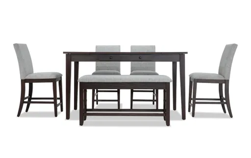 You may be tight on space, but never tight on storage! My counter height Homeworks dining table features lift-top storage on either end and two felt-lined storage drawers, perfect for storing your extra dining ware or homework essentials! Then, it's all wrapped up in a sturdy rubberwood frame complete with a durable easy-to-clean melamine finish that's resistant to moisture, heat, stains, fading, chipping and peeling... you name it! And I haven't even mentioned the cozy dining bench (with even more storage!) and four upholstered stools—all filled with Bob-O-Pedic Memory Foam! —for a comfortable meal, every time.