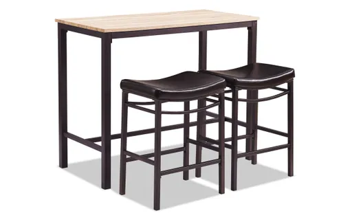 The Misty 3 Piece Pub Set is perfect for small dining spaces or kitchen breakfast nooks. The table has a brown metal base accented by a rustic blonde top and each stool features a swooping seat upholstered in black. Get all the style you desire at a price that you can afford.