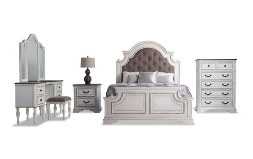 Wake up in your very own cottage with my Scarlett Bedroom Set with complete vanity. You'll absolutely love my eye-catching upholstered bed that complements your cozy, lived in style. And the value doesn't end there. You'll love my lift top chest with mirror and jewelry box packed with storage to keep you organized. My nightstand has dual USB ports to keep your favorite devices charged while getting ready for a night out or cozying up with your favorite book. Plus the stunning white, naturally distressed finish with antique brass hardware that give my set a unique one-of-a-kind look with the features you deserve! Cedar lined bottom drawers and felt lined top drawers seal the deal as the perfect finishing touch. Why not treat yourself?