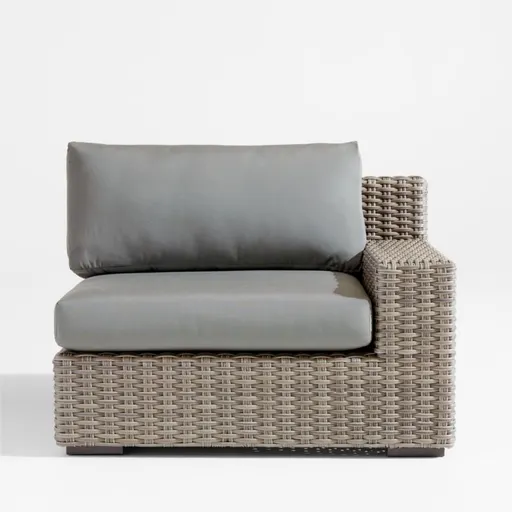 Low-slung and ready to lounge, our Abaco outdoor sectional collection extends an invitation to kick back and relax. Each right-arm lounge chair is handwoven in grey-brown, weather-resistant resin wicker in a chunky, textural weave. The chair's modern, boldly proportioned frame of lightweight aluminum offers a deep seat and a wide, boxy arm that's perfect for hosting a cool drink. Neatly tailored with bullnose fronts and boxed sides, the grey seat and back cushions add on a layer of comfort covered in fade-, stain-, water- and mildew-resistant Sunbrella acrylic. The right-arm lounge chair with cushions combines with other Abaco sectional components to fashion outdoor seating tailored to your great outdoors.