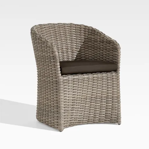 Handwoven with a chunky, textural weave, Abaco curves a graceful barrel-back dining chair in weather-resistant resin wicker. Exhibiting a variety of grey-brown shades, the wicker replicates the nuanced color of well-worn rattan. Covered in fade-, stain-, water- and mildew-resistant Sunbrella acrylic, the neatly tailored seat cushion adds an extra layer of comfort. The Abaco Outdoor Dining Chair with Natural Sunbrella ® Cushion is a Crate and Barrel exclusive.
