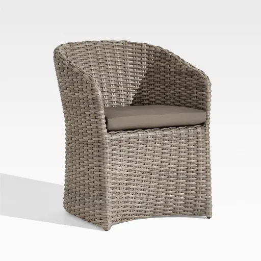 Handwoven with a chunky, textural weave, Abaco curves a graceful barrel-back dining chair in weather-resistant resin wicker. Exhibiting a variety of grey-brown shades, the wicker replicates the nuanced color of well-worn rattan. Covered in fade-, stain-, water- and mildew-resistant Sunbrella acrylic, the neatly tailored seat cushion adds an extra layer of comfort. The Abaco Outdoor Dining Chair with Natural Sunbrella ® Cushion is a Crate and Barrel exclusive.