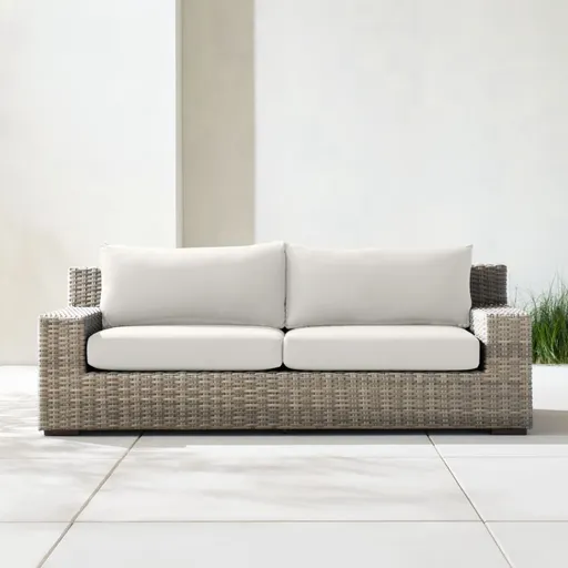 Low-slung and ready to lounge, our Abaco outdoor sofa extends an invitation to kick back and relax. Handwoven with a chunky, textural weave, the weather-resistant resin wicker exhibits a variety of grey-brown shades to replicate the nuanced color of well-worn rattan. Bold, modern frame of lightweight aluminum offers deep seats and wide, boxy arms perfect for a cool drink. A cushion covered in fade-, stain-, water- and mildew-resistant Sunbrella acrylic adds an extra layer of comfort. The Abaco Outdoor Sofa with Natural Sand Sunbrella ® Cushions is a Crate and Barrel exclusive.