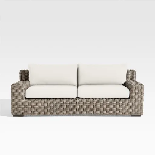 Low-slung and ready to lounge, our Abaco outdoor sofa extends an invitation to kick back and relax. Handwoven with a chunky, textural weave, the weather-resistant resin wicker exhibits a variety of grey-brown shades to replicate the nuanced color of well-worn rattan. Bold, modern frame of lightweight aluminum offers deep seats and wide, boxy arms perfect for a cool drink. A cushion covered in fade-, stain-, water- and mildew-resistant Sunbrella acrylic adds an extra layer of comfort. The Abaco Outdoor Sofa with Natural Sand Sunbrella ® Cushions is a Crate and Barrel exclusive.
