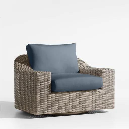 Low-slung and ready to lounge, our Abaco outdoor swivel lounge chair extends an invitation to kick back and relax. Handwoven with a chunky, textural weave, the weather-resistant resin wicker exhibits a variety of taupe shades to replicate the nuanced color of well-worn rattan. The bold, modern swivel chair offers a deep seat, gracefully curved back and wide, boxy arms perfect for a cool drink. A cushion covered in stain- and fade-resistant Sunbrella adds an extra layer of comfort.