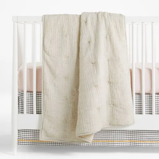 Soft and airy, like curling up in a cloud. Our neutral stone tan Aire crib quilt features a double layer of gauzy crinkle fabric on the front accented with delightful thread tufts to add to the cozy factor. A smooth cotton-linen reverse and self piping around the edges gives the quilt a tailored finish.