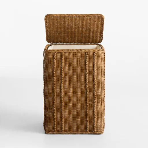 Our versatile Alford collection now includes display-worthy storage options to keep all of your essentials corralled in style. Stained golden honey-brown, natural rattan is handwoven by skilled craftspeople into a display-worthy hamper. A flip-top lid conceals laundry while maintaining breathability, and graceful braided accents emphasize the basket's artisanship and elevated organic beauty. Fitted with a polyester-lined organic cotton liner, the basketweave hamper combines with our other woven Alford pieces for a new take on a timeless classic.