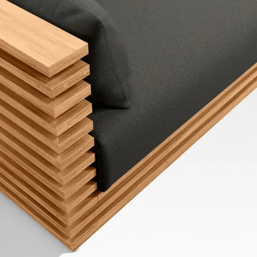 Modern and made for the outdoors, Batten's modular design flexes with your space and entertaining style. Crafted of sustainably sourced, unfinished solid teak, it is built to last a lifetime. The sectional's bold slats, striking linear profile and minimalist silhouette give it a distinctly modern look. A cozy mix of plush seat, back and lumbar cushions plus throw pillows provides unrivaled comfort and can all be upholstered in a weather-resistant fabric of your choice. Leave this untreated natural teak uncovered and it will patina to a beautiful silvery grey over time.