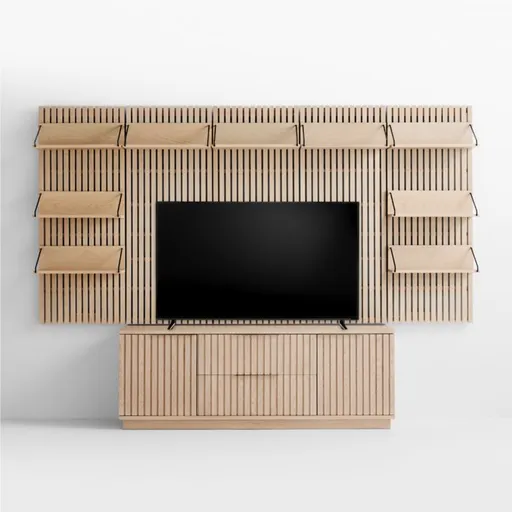 Showcasing our Batten collection's signature blend of modern design and natural materials, this modular home storage solution makes the most of wall space. We've put together this configuration to maximize storage in your living or media room, each piece made of beautiful oak veneer and crafted with dynamic linear interest. Five slatted back panels mount on the wall to provide a backdrop for affixing nine reversible shelves that hang with brackets on top or underneath to give you lots of storage options. Down below a freestanding media console clad in solid wood slats adds closed storage with a pair of drawers flanked by a cabinet on either side.