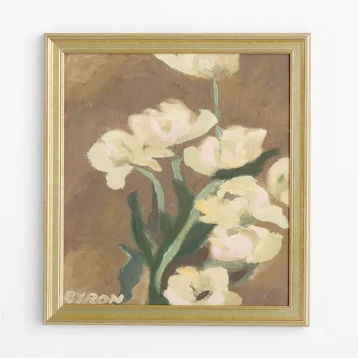 Sadie Bryon brings her experience as both a sculptor and a floral designer to this delightful still life. Simplified shapes, expressive brushwork and an up-close vantage point underscore the lush forms and subtle coloring of the Belle Epoque tulips, the artist's favorite variety. Originally painted in oils, this charming still life is reproduced as a giclee print and presented in a wood frame finished in gold.