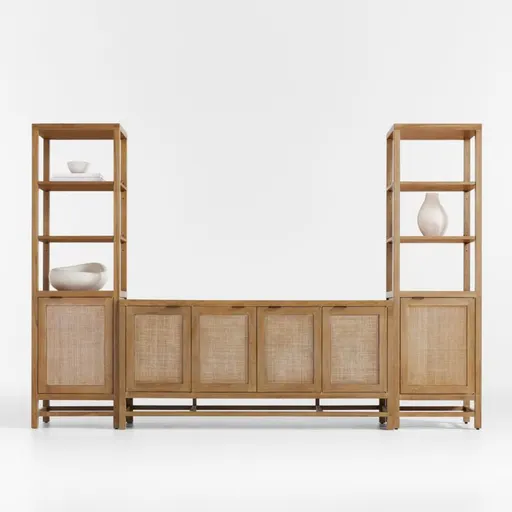 A blend of natural materials and classic design creates this beautiful, mid-century-inspired collection. FSC ®-certified teak and teak veneer frames showcase doors inset with panels of handwoven natural rattan. Finished in light brown and accented with antique brass pulls, this combination of media console and two tall cabinets brings a relaxed look to the living room, family room or office. The Blake Light Brown Teak Media Console with 2 Tall Cabinets is a Crate and Barrel exclusive.