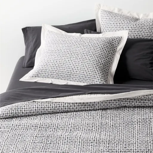 Inspired by vintage wallpaper, our Celeste bedding charms with artisanal quality and an heirloom vibe. Skilled craftspeople print the pattern of sky-blue stepped diamonds and black dashes on white organic cotton by hand using traditional blocks. The fabric is then quilted by hand and finished with generous flange borders. Fascinating variations in the printing—one of our favorite aspects of this intensive craft—make each quilt and pillow sham beautifully unique. Add the matching shams to complete the modern-homespun look.