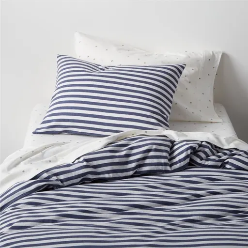 Softer than their favorite tee, cool to the touch and yarn-dyed for long-lasting color, our Organic Cotton Jersey Duvet Cover just changed the bedding game. And by choosing organic cotton, you're helping create a better future for your kids: Compared to conventional cotton, it can reduce CO2 by 46%, energy consumption by 62% and irrigated water consumption by 90%. With coordinating stripe and solid Organic Cotton Jersey Sheets in a range of rich hues, kiddos will love all the ways they can create their own personal look. And don't forget one of our duvet inserts for the perfect amount of all-season warmth and comfort.