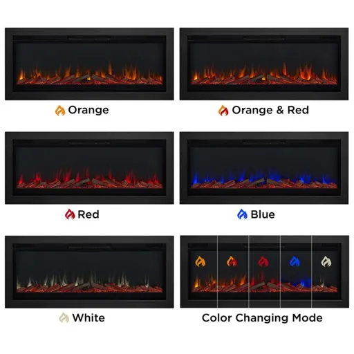A modern fireplace for modern living. Create a covetable feature in your home with this sleek wall-hung hearth. The low-profile electric fireplace wows with clean lines and black-bordered glass that highlights the drama of the dancing flames. Customize the look of your fire with faux logs plus two fill options—stones and crystals—and six flame color choices. Providing supplemental heat for up to 1,000 square feet, the fireplace offers six temperature settings as well as a heatless flame option for those times when you want the look but not the warmth of fire. The easy-to-use remote control allows you to adjust all of these variables and more from your sofa or bed.