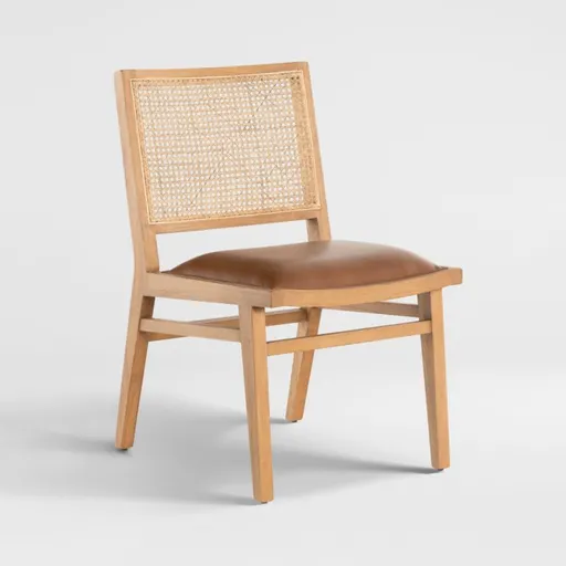 Sleek wood, leather-like fabric and breezy cane load on the texture in our Dalton dining chair. Sand-colored beech fashions the clean-lined frame inset on the back with natural woven cane. The comfy-cushioned seat is clad in faux leather tinted a warm shade of butterscotch.