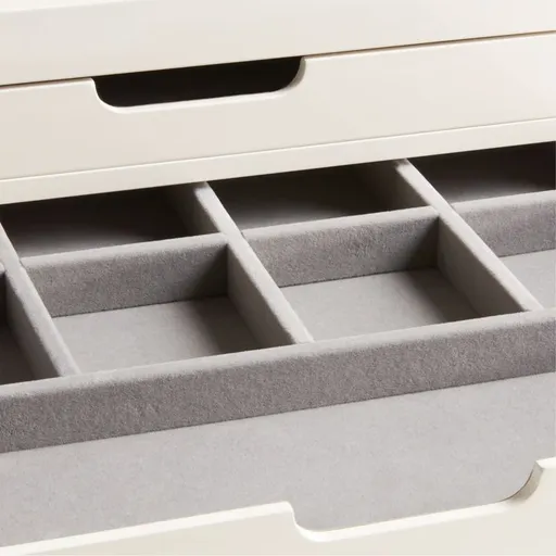 Our modern, minimalist storage box keeps your jewelry collection organized and accessible. Constructed of wood with a cream lacquer finish, the case boasts clean curves for a fresh look. Multiple compartments lined in soft grey velvet provide spots for your rings, earrings, bracelets, cufflinks, watches and more. Fitted with a mirror in its lid, the box also serves as a compact getting-ready station—or use the removable tray drawers to stage the pieces you plan to wear together. Our extra-large jewelry box is a Crate & Barrel exclusive.