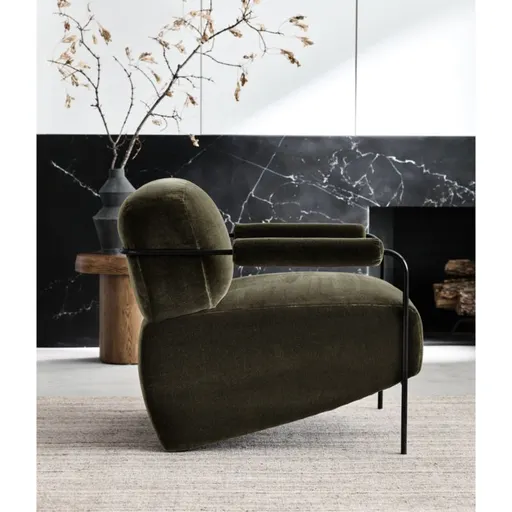 It's difficult to pick out our favorite thing about the Faroe chair—be it the sculptural design, plush comfort or attention-getting color. Based on a 1950s design, the accent chair belies its petite scale with the bold forms of its blocky back cushion, padded cylindrical armrests and a wedge-shaped seat set at a rakish angle. Slim metal rods balance the proportions, flowing in one continuous line from leg to back. Inspired by the lush greenery of the Faroe Islands, the deep green fabric is a velvet-like faux mohair with a luster that catches the light for nuanced color shifts. We love Faroe's stylized look combined with its livable proportions and medium-soft, very comfortable sit.