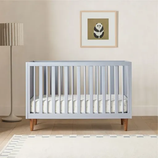 Clean lines, elevated paneling and an on-trend (and gender-neutral) mist blue hue: Count us in! Largely inspired by Scandinavian farmhouse design, our Finn kid's furniture collection blends rustic charm and modern minimalism without skipping a beat. With gently tapered oak legs in a natural finish, the crib's calming two-tone palette translates perfectly in a nursery, while the solid wood rails and spindles lend stability and timeless style that can be passed down through the years. It seamlessly grows with your little one thanks to the easy-to-assemble Toddler Bed Rail. Learn how to choose a crib.