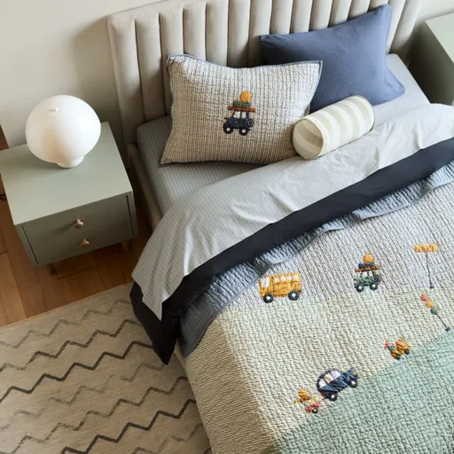 Largely inspired by Scandinavian farmhouse design, our Finn collection blends rustic charm and modern minimalism. The upholstered bed is designed to pair seamlessly with the rest of the collection, with a channel-tufted headboard that mimics wood paneling. The oversized headboard provides a comfy spot for lounging and reading, and the natural-hued fabric wraps the entire frame for complete softness. Tapered solid wood legs add a bit of a lift plus a touch of natural warmth. This cool, modern design will grow with little ones through each stage. Pair it with our Finn Dresser, Nightstand and Bookcase for a coordinated look.