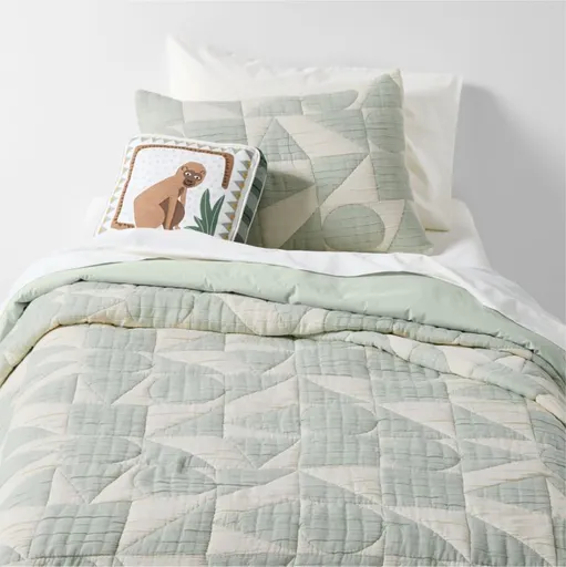 Striking but with a soft side, our Geo Matelasse Quilt features a graphic lineup of shapes in muted tones of teal and soft ecru. Each circle, square and triangle is woven through the unbleached organic cotton gauze with a technique called matelasse, making the quilt fully reversible and extra fluffy. The feel? Plush, downy and cozy yet breathable—in other words, the perfect quilt to snuggle up with year-round.