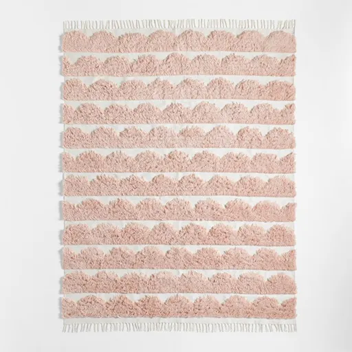 Stripes of fanciful scallops make any room feel more upbeat and fun. Handwoven of easy-care synthetic fibers in a high-low pile that's springy and soft underfoot, our rug features a delightful combination of puffy pink scallops on a cream background. The pattern-happy design gets tasseled ends for a fluttery finish, and its performance fabric makes it a durable choice for nurseries, playrooms and other high-traffic areas.