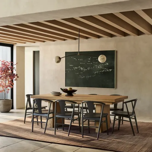 A masterpiece of Italian ingenuity, our Ibiza table features a unique extension mechanism that seamlessly transitions from seating 8 to 12. To expand the table, the four corners slide out effortlessly on metal glides to reveal three self-storing butterfly leaves that unfold with leather tabs. Closed or open, the table displays the captivating grain variations inherent to natural oak in the expansive top and plank style legs.