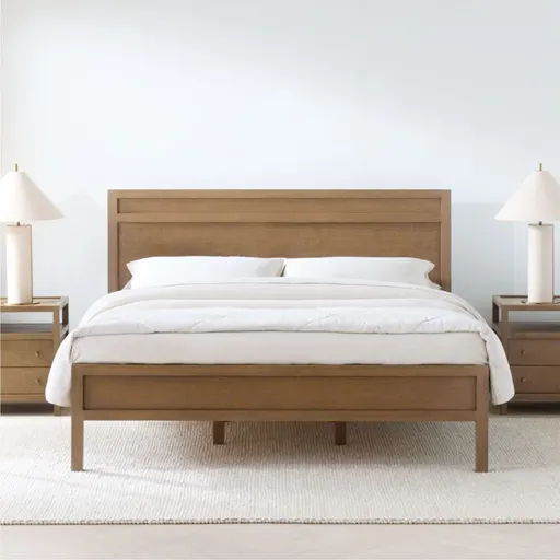 Keane streamlines a classic modern bed in beautiful mahogany lightened with a driftwood finish. The Keane bed features an architectural yet informal frame for any style bedroom. Our best-selling Keane collection is a Crate & Barrel exclusive. Designed by Bill Eastburn of William Eastburn Design. FSC ® mahogany with grey wash driftwood finish and engineered wood. Expansion and contraction may occur with seasonal changes in humidity. Slat support system makes box spring optional. Mattresses and optional bunky board available (sold separately). Levelers included. Made in Indonesia.