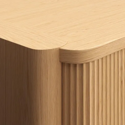 Kensington takes a sophisticated approach to bedroom storage with organic texture and rounded details. A study in curves, the dresser features racetrack-shaped legs that extend to the top and rounded drawer fronts. Made of sustainably sourced oak, the dresser shows off the beauty of the wood with a natural finish and a fluted facade. Long pulls punctuated with sphere ends add horizontal interest and the warm glow of burnished brass.