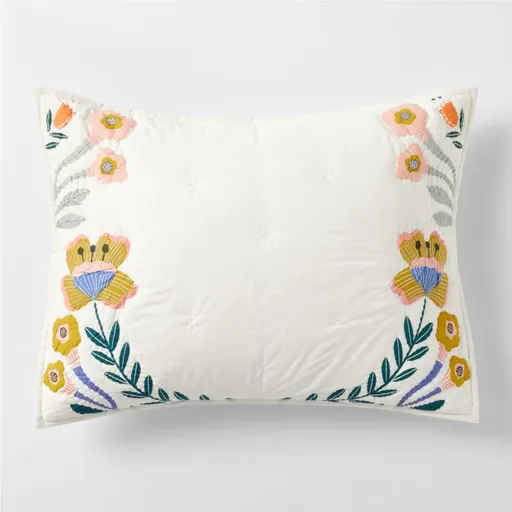 In a colorful convergence of flora and fauna, our organic cotton Koshi bedding gives traditional folk art a kid-approved refresh with whimsical designs in modern hues. Botanicals grow across the pillow sham's bottom edge and up both sides, lookin' especially lush and colorful against the cream-colored cotton. Complete this sweet-and-chic bedding look with our coordinating Koshi quilt and sheet set.