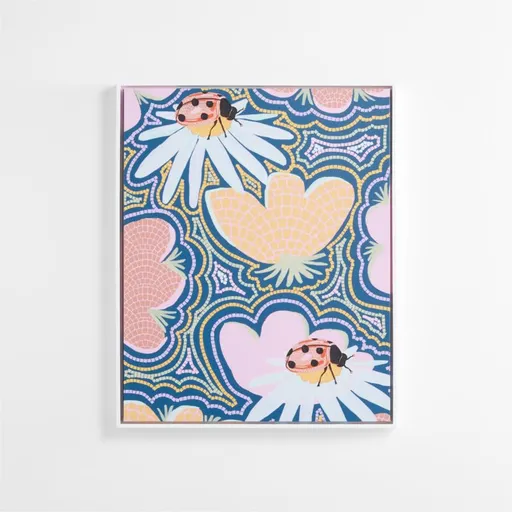 Energetic and playful with a hint of groovy, artist Leeya Make Noise finds expressive ways to bring whimsy and wonderment to your kiddo's space. This framed canvas artwork takes pattern and color to new creative heights, showcasing ladybugs and abstract botanical illustrations through bold use of hues and reverberating linework. A Crate & Kids exclusive, the artwork is printed on canvas within a white frame.