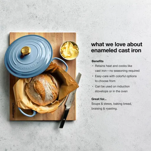 Creamy white enamel glazes the exterior of our exclusive everyday pan, while the interior boasts a low-maintenance black satin finish that develops a virtually non-stick patina. Along with its wide cooking surface, the pan also offers a generous depth and subtly curved sides that make it easy to stir and flip. Le Creuset's coveted cast iron distributes heat evenly, requires no seasoning and stands up to metal utensils. Ideal for roasting, frying, simmering and more, the versatile pan goes effortlessly from stove to oven to table. Revered by both professional chefs and home cooks since its 1925 debut, Le Creuset's classic French cookware is prized for its utilitarian beauty and unsurpassed heat retention.
