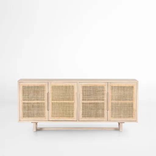 Linear meets coastal in Libby. Framed in whitewashed mango wood, the credenza gets a breezy boost from woven cane door fronts. Long vertical pulls and an open trestle base enhance the geometric silhouette, while the cane's relaxed weave provides a veiled glimpse of what's stored inside. Each double-doored cabinet opens to a single adjustable shelf to house dinnerware, serving pieces or table linens. The Libby natural credenza is a Crate & Barrel exclusive.