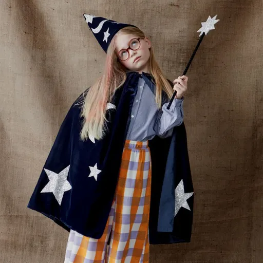 Let the magic begin with the Meri Meri blue velvet wizard costume. This spellbinding set features a deep blue velvet cape lined with cotton and sprinkled with silver stars and moons, plus a pointed hat to match. A wooden wand wrapped in velvet ribbon and topped with a glittering star completes the look. Whether they're mixing potions or making up spells, it's an imagination-boosting essential for magical play.