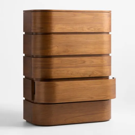 Milano looks to Italian design for its modern way with wood. Walnut veneer shapes the dresser with extravagantly curved corners and seamlessly integrated drawers that put all the focus on the beautiful wood grain. Recessed accents divide the tall dresser horizontally, lending linear interest as well as carving out the five drawers with hidden finger pulls. A stunning addition to your bedroom, the dresser is part of our exclusive Milano bedroom collection.