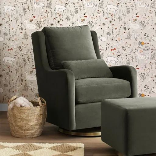 We tried to find the words to describe just how comfortable our exclusive Milo Swivel Glider is. In the end, the words "ridiculously comfortable" kept coming out of our mouths. This modern upholstered swivel glider was exclusively designed just for us by the amazing artisans at Monte Design. It features a kiln-dried hardwood frame, which will be sure to last for years to come. The incredible brushed gold metal pedestal base gives this swivel glider a look like no other. GREENGUARD Gold Certified, contributing to cleaner air in your home. Meets or exceeds applicable U.S. safety standards. Designed and handcrafted in Canada by Monte ™. 360-degree swivel glider mechanism. Engineered wood frame. Upholstered by hand in polyester fabric. Cushions: foam, polyester down-alternative feather and polyester fiber. Metal base with brushed gold finish. Sinuous wire suspension. Monte products use only the highest quality materials, including flame retardant free-foams, water-based glues and lead-free and low solvent-based paints and finishes. All rockers and gliders include a lumbar pillow which can be used under the arm for feeding, as a head rest, as well as additional lumbar support. Monte suppliers re-plant an average of 3–4 trees for each one harvested. Made in Canada.