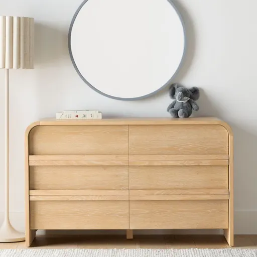 Light, bright storage done right. Our solid oak Mira Dresser features waterfall edges and a lightly cerused finish for a contemporary, coastal look that works in any space. Six roomy drawers provide enough storage for all your baby essentials now, and a full wardrobe of clothes through the teenage years.