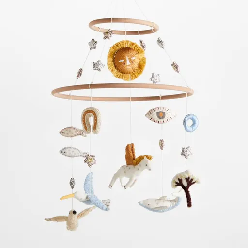 Our Montcalm Baby Mobile by Jeremiah Brent brings a dream-like quality to the nursery. Inspired by Jeremiah's childhood and his own kids' imaginings, the mobile features a winged pegasus, a lucky horseshoe and other symbols of myth and good fortune, all floating beneath a golden sun and twinkling stars. Each piece is made of natural flecked organic cotton and decorated with intricate embroidery and metallic accents.
