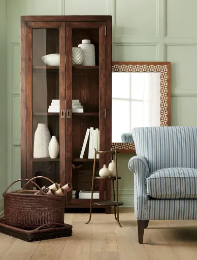 Our Morris collection reclaims pinewood pallets, expertly refinishing them to create this statement-making bookcase. The rustic-refined Morris Bookcase provides ample storage on four fixed shelves—clearly visible through glass front and side panels—and is outfitted with metal hardware with a rich antiqued brass finish.