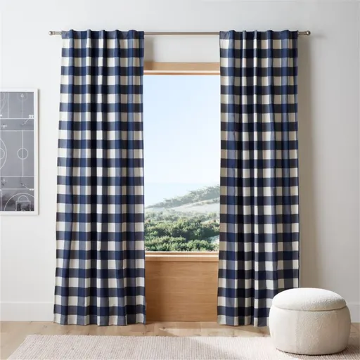 Oversize buffalo check printed in yarn-dyed hues of navy blue makes a classic style statement for the nursery or kids room. Crisply tailored of pure cotton, our curtain panel features a thick lining that blocks out light to create a restful environment even during the brightest daylight hours. Curtain hardware also available.
