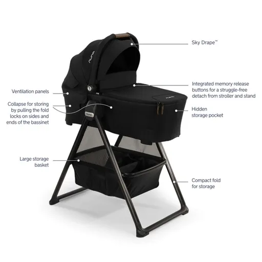 Soft and snug for day and night sleeping, the Nuna LYTL bassinet gives new parents plenty of options. Use the black bassinet with the included stand around the house, by your bedside or while traveling for an on-the-go nursery. (The stand is even sized at the perfect height to keep baby bedside and within arm's reach during those early months.) Need to make a move? With a simple click, memory-release buttons make it simple to detach the bassinet from the frame and connect it to the TRIV stroller for neighborhood adventures (sold separately). The bassinet boasts mesh ventilation panels, UPF 50+ canopy and pull-down Sky drape to keep baby comfortable. The bassinet stand's spacious storage basket is perfect for holding naptime necessities, and it folds and unfolds with one hand, making it easy to reposition at home or on an overnight trip.