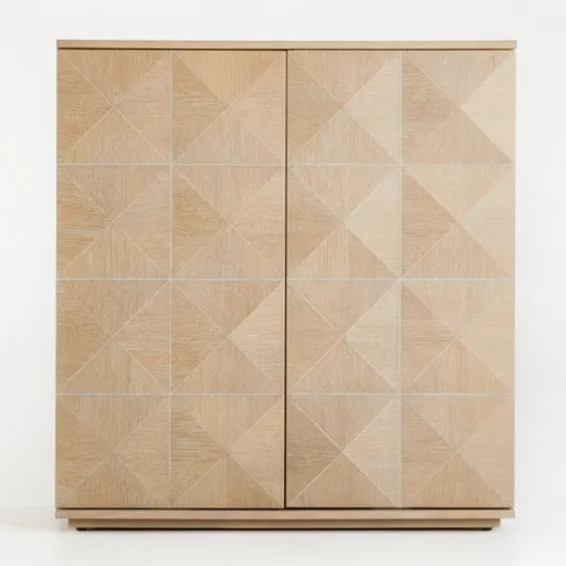 The faceted doors of this entryway cabinet feature a grid of pyramids, creating a three-dimensional facade of beautiful wood with a natural finish that showcases the grain. Keep your out-the-door essentials corralled and right where you need them in this stunning cabinet. Behind the doors are two adjustable shelves, perfect for holding baskets or bins filled with outdoor gear, mail and more. Built-in cord cutouts make the modern hutch an ideal spot for concealing speakers. Make the most of entryways large and small with our exquisite Outline entryway cabinet, a Crate and Barrel exclusive.
