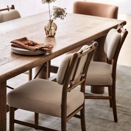 Crafted with vintage-inspired woodworking, our carefully designed oak dining chair showcases subtly tapered legs, bullnose feet and through-dowel detailing on the back crossbars. A linen-blend, natural-hued fabric layers on texture to the well-padded seat and the removable cushion that attaches to the back with fabric straps.
