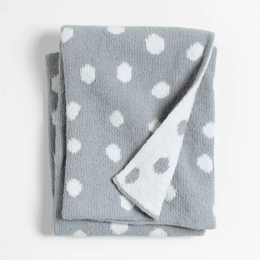 For cozy-comfort beyond the crib, our chenille stroller blanket is a lofty layer that babies will love. In a white and mist blue design, irregular circles float across the background in true whimsical fashion. The fuzzy chenille (which is French for caterpillar!) yarn is outrageously soft to the touch and keeps littles ones at a comfortable temp wherever the road takes them. The back features the same design in reversed-out hues.