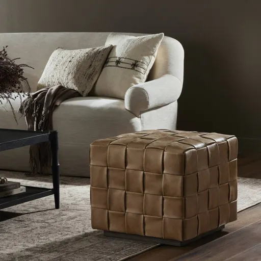 Top-grain leather and woven texture elevate the humble ottoman to a statement-making accent piece in Ronan. Wide strips of top-grain leather in light brown are handwoven into a chunky basketweave for a look that's equal parts modern and retro. Set on a recessed plinth of solid oak, the footstool multitasks as an extra seat or tray table.