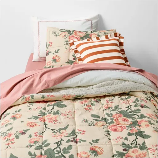 For our Rose Meadow quilted comforter, designer Louise Roe was inspired by the English countryside (you can practically imagine a flock of sheep outside the window). On one side, the reversible comforter showcases a floral and blackberry bramble chintz in warm peach and buttery tones; on the other, a delicate ditsy floral print. Fashioned after traditional eiderdown quilted bed toppers, this modern take is made of organic cotton with a recycled polyester fill—the perfect weight for hot and cool sleepers alike. Pair with the matching pillow sham for a coordinated look.