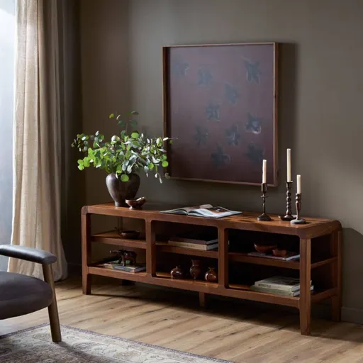 Rounded legs and corners soften the linear look of the Saul console table with organic curves. Made of solid walnut and walnut veneer, the table has a rich dark walnut finish that enhances the silhouette while highlighting the wood grain. Open shelving provides two tiers of display space, making the table perfect for displaying books, media components or collectibles.