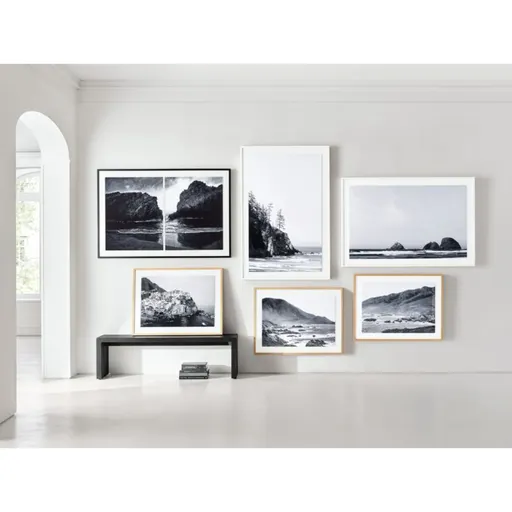 Depicting a spot where forest meets ocean, Eric Muhr focused his lens on this dramatic cliffside. The image explores the full range of black-and-white photography, from the deep blacks of the rocky shadows to the white surf and mid-greys of the sea. Each print is presented in a whitewash wood frame under acrylic glass for a clean, modern look.