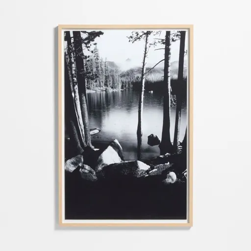 While exploring the jagged Sierra Nevada, artist Jennifer MaHarry happened upon a misty alpine lake and set about capturing the moment of tranquility. Her black-and-white photo places the viewer upon the lakeside boulders, gazing between slender trees to the pine forests across the water. "Sierra Nevada Lake" is presented in a wooden frame that contrasts warmly with the black-and-white print.
